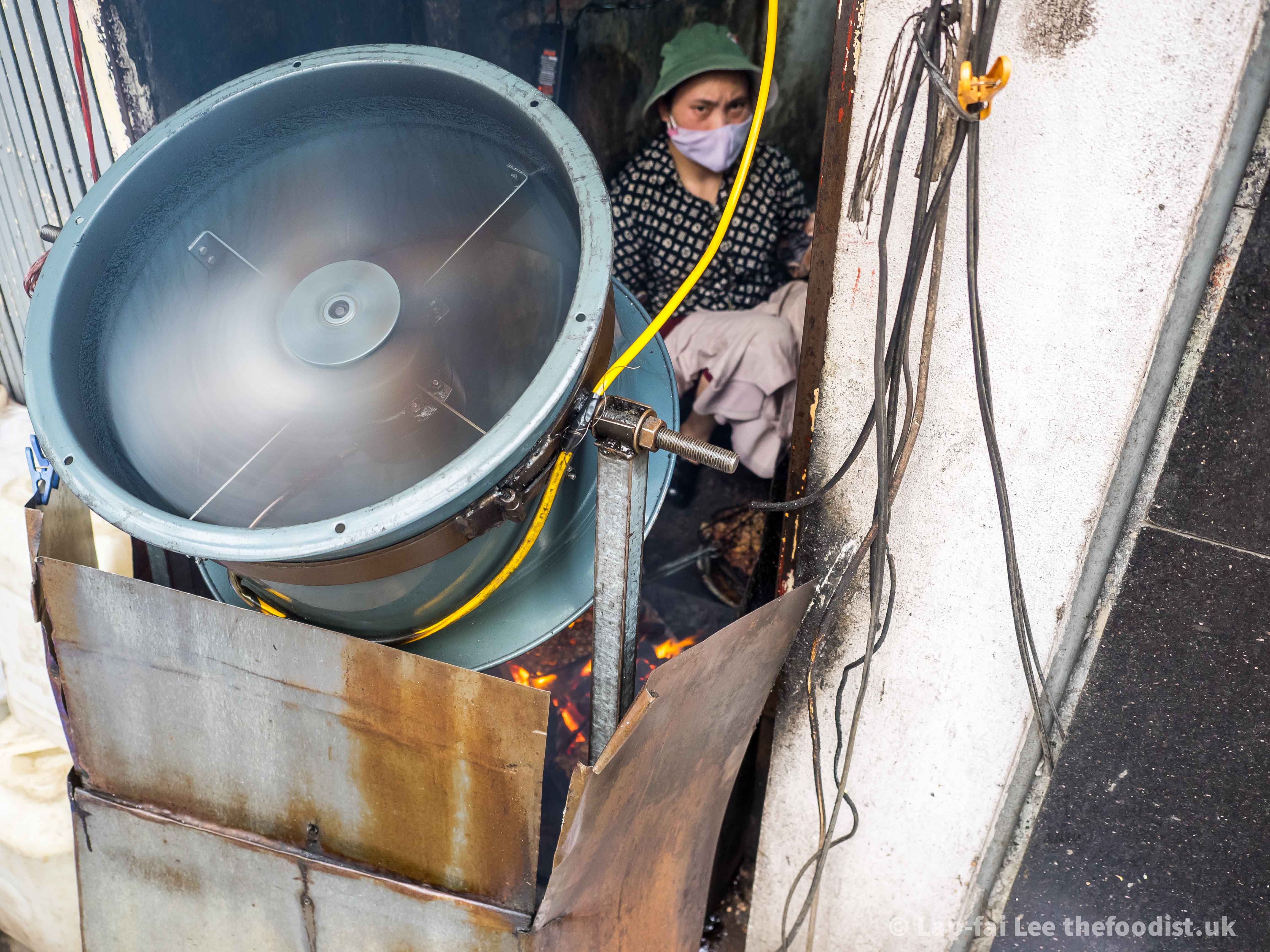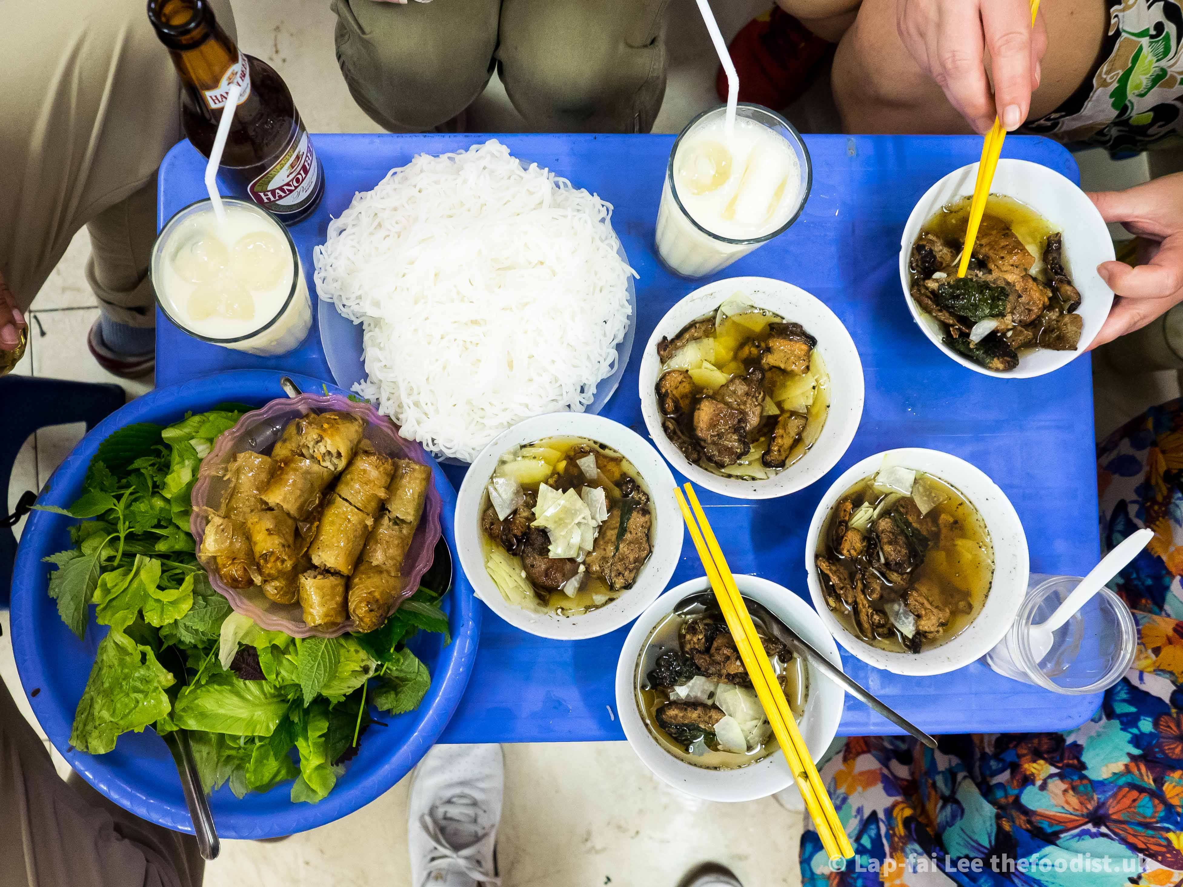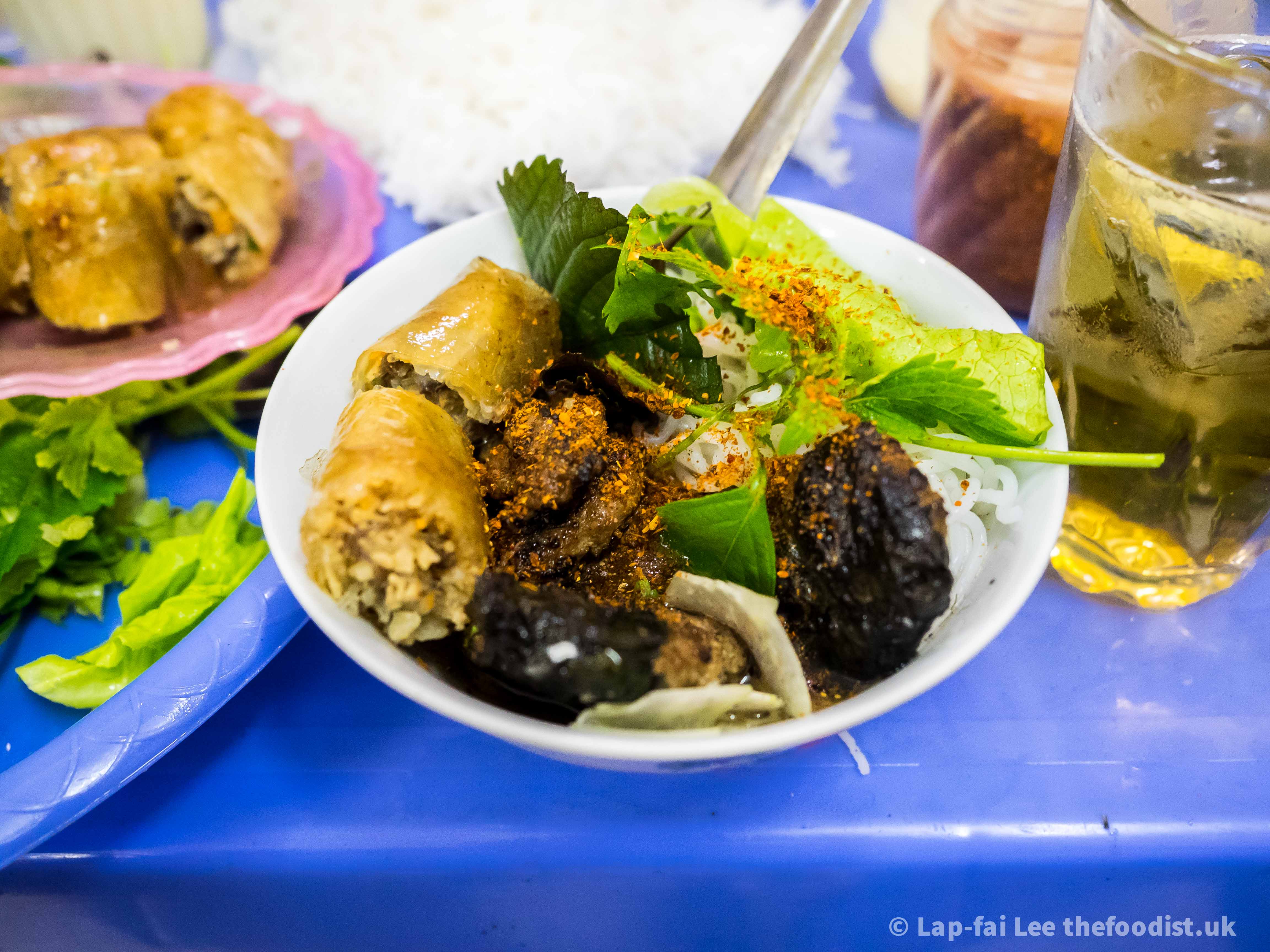 The bigger the fan the hotter the coals, the faster you can grill the slithers of pork neck to succulence whilst getting the all important char on the outside. This was the biggest fan and best bun cha we tried, wonderfully charred and juicy. With extra pork patties wrapped in betel leaves and crispy nem spring rolls for good measure. The pork sits in a light dressing with pickled jicama. Springy almost fluffy rice noodles and a bouquet of fresh herbs such as perilla, sweet basil, coriander are dunked into the bowl and devoured greedily.
